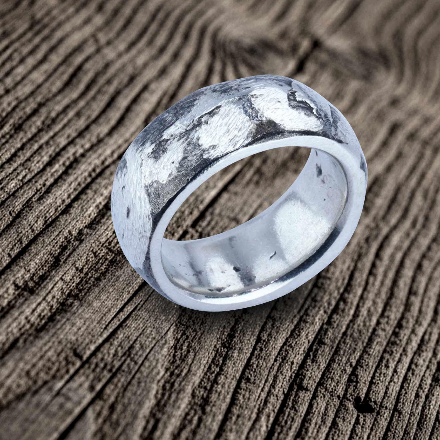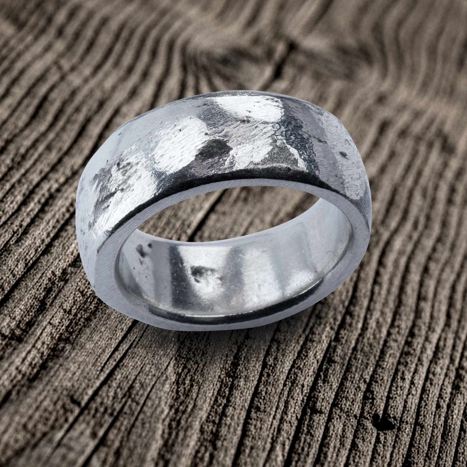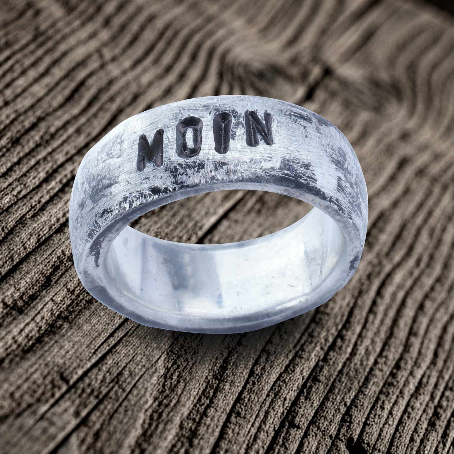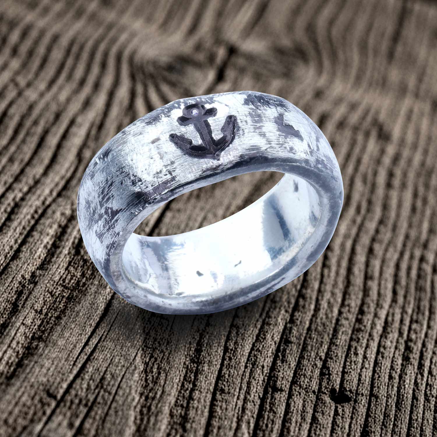 Schön abgenutzt: von Hand zerkratzt, gefeilt und heruntergerockt. Gefeilte Spuren, geschwärzt und geschliffen, ein echtes Zeugnis von Zeit. Dieser Ring ziert mit Sicherheit viele Jahre Deine Hand. Die Gestaltung kannst dabei Du selbst übernehmen: ein oder zwei Namen? Ein Lebensmotto oder ein freches Schlagwort? Vielleicht Geburtsdaten von Kindern? Du hast die freie Wahl. Grenzen setzt nur die mögliche Anzahl der Zeichen. Darüber hinaus kannst Du sogar noch eine Widmung anbringen lassen.  Durch die gefeilte Obrerfläche bildet sich eine wirklich einzigartige Struktur, die auf jedem Ring einzigartig ist. Ein echt kraftvolles Fingerschiff von Neptunsgeschmeide. Dessen ungeachtet kommt der Ring an schmalen und zarten Händen ebenso gut wie an kräftigen Hafenpranken. Darum eignet er sich auch für jedes Alter und jedes Geschlecht.