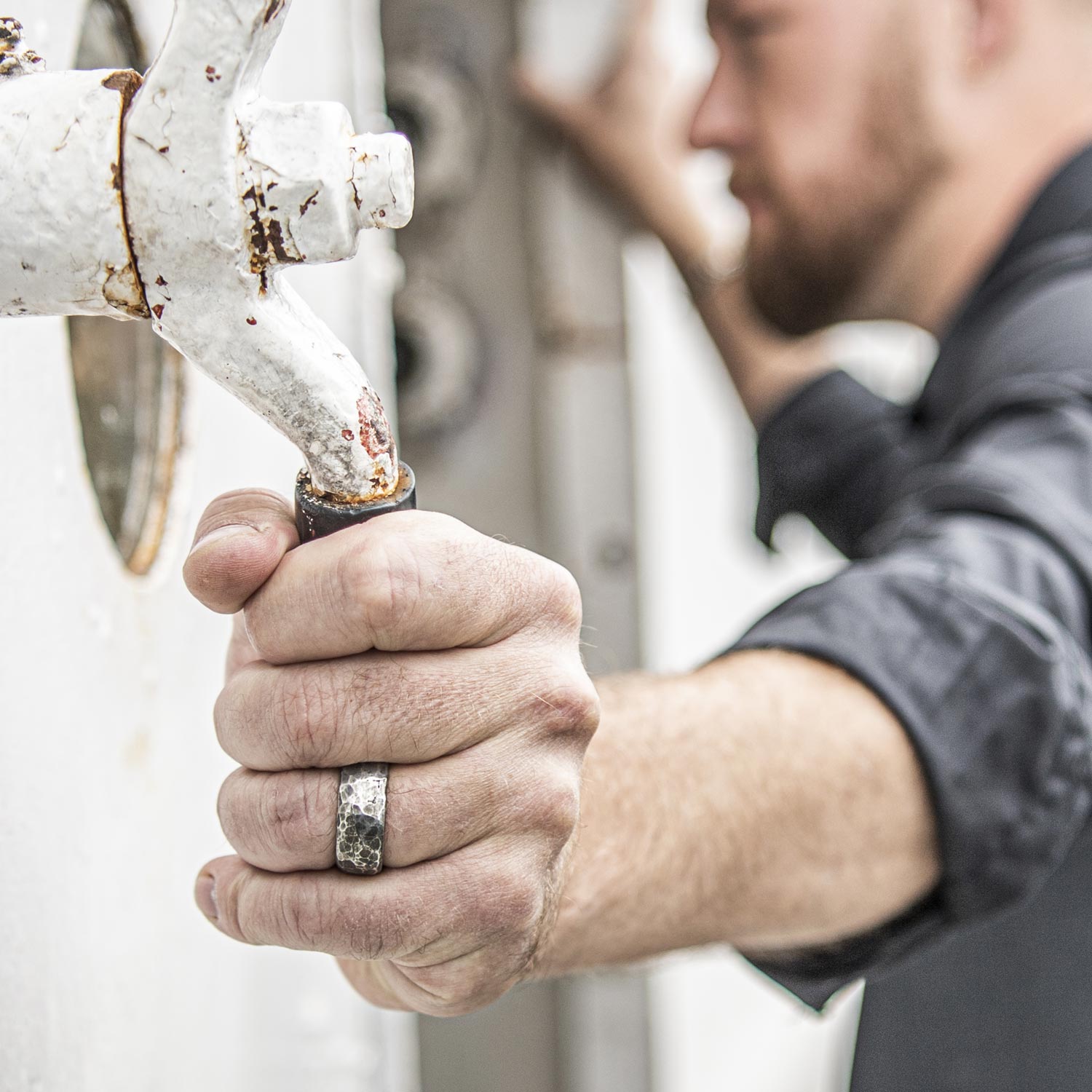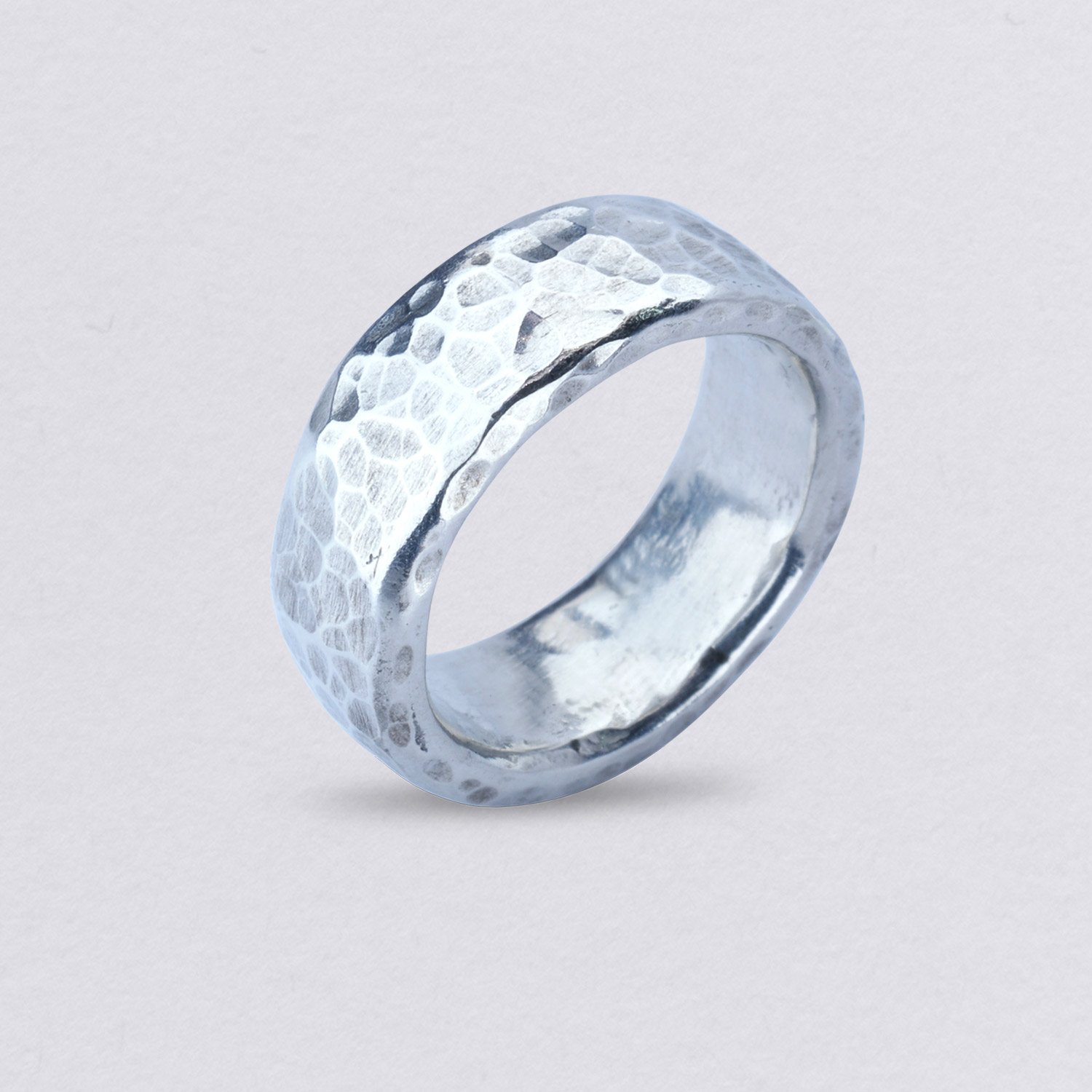 Wir fertigen den Ring aus einer hochwertigen, silberhaltigen (<1%) Schmucklegierung aus Zinn. Das Vollmaterial Zinn lässt, sich immer wieder ohne Qualitätsverlust aufpolieren. Durch die Handfertigung im eigenen Atelier entsteht eine individuelle Oberfläche, jeder Guss erhält einen persönlichen Charme.