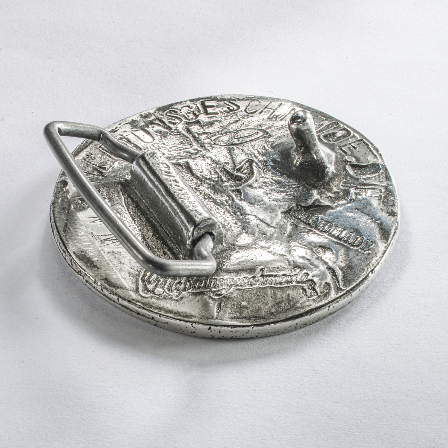 Hochwertige Schmucklegierung aus Zinn mit einem Silberanteil von <1%. Dieses Vollmaterial lässt sich immer wieder ohne Qualitätsverlust aufpolieren. Deine massive, langlebige Gürtelschnalle verliert so nie ihre schimmernde Schönheit. Das Aufpolieren übernehmen übrigens gerne wir: Besuch uns einfach auf einer Veranstaltung an unserem Stand. Geht ruckzuck und kostet nichts.