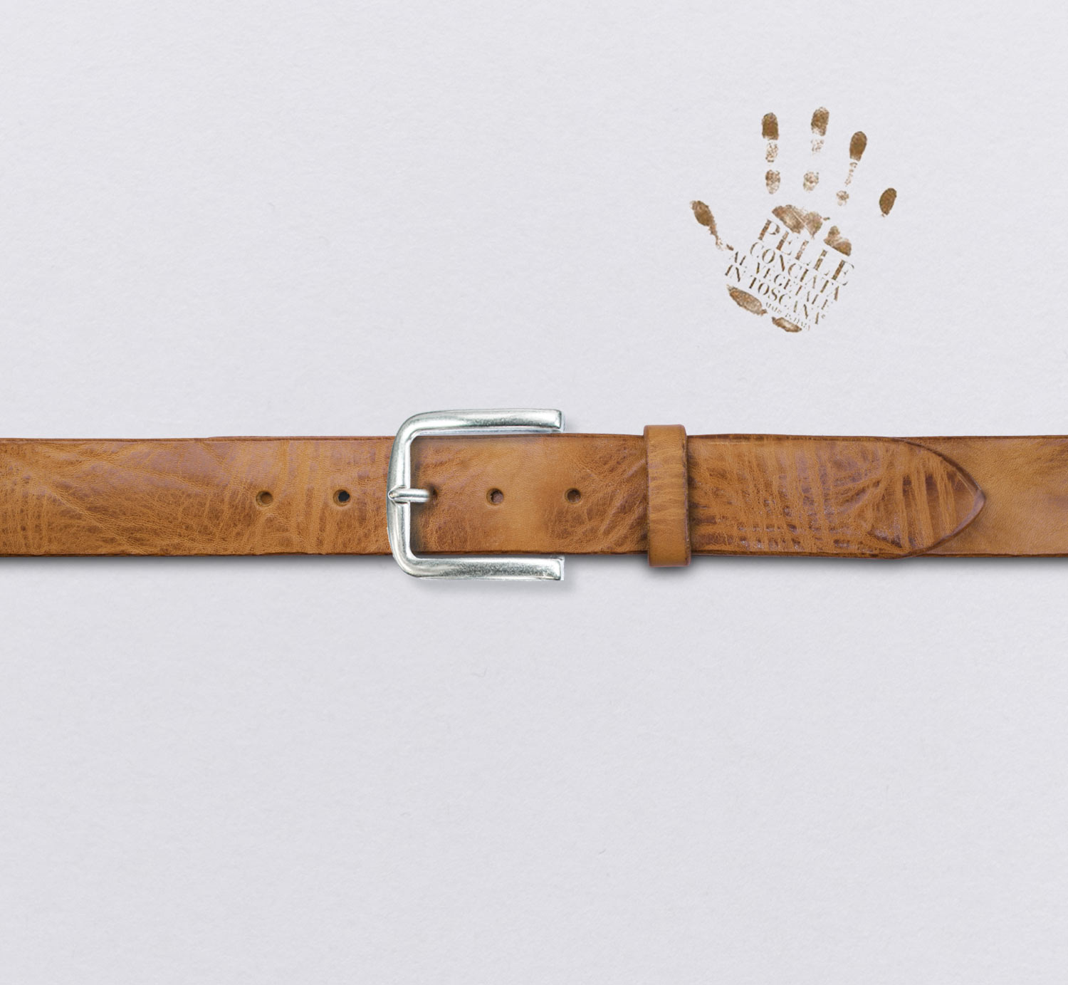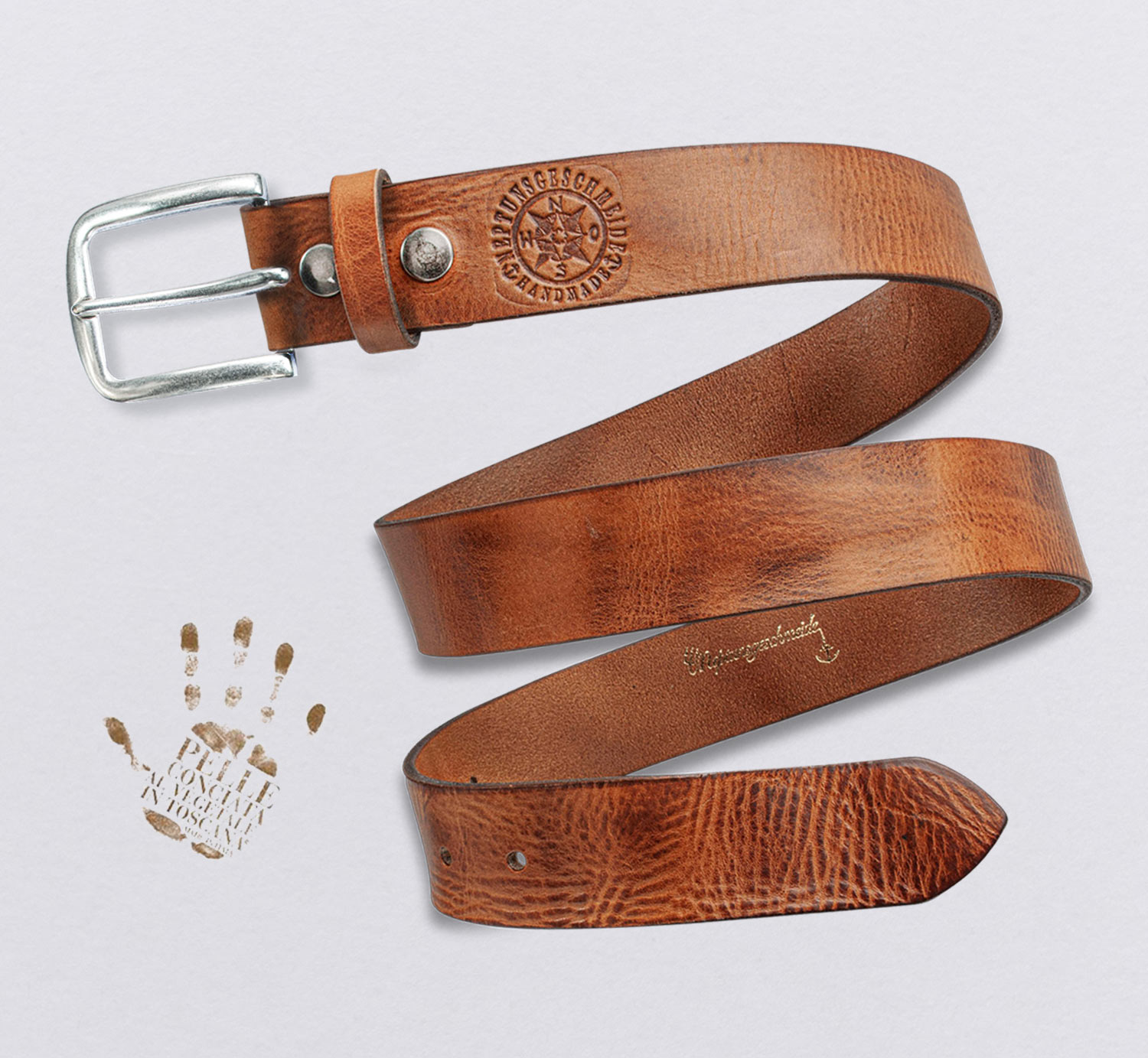 Dieses Leder hat besondere Eigenschaften: Es ist voluminös, griffig und anschmiegsam, ohne sich dabei hart anzufühlen. Es hat ein einzigartiges welliges Farbenspiel mit feinen, sich abwechselnden Nuancen von hellen bis mittleren Brauntönen. Auch der feine Duft der Inhaltsstoffe der komplett pflanzlichen Gerbung demonstriert hier perfektes Geberhandwerk. Dieses Leder besitzt das Gütesiegel: „Pelle Conciata vegetale in Toscana, made in Italy“. Wir haben diese tolle Gerberei auf der Messe „Lineapelle“ in Mailand kennen und schätzen gelernt. Nur pflanzlich gegerbtes Leder entwickelt diese einzigartige Patina, wird umweltfreundlich produziert und riecht angenehm nach natürlichen Gerbstoffen und nicht nach Chemikalien! Wir fertigen den Gürtel aus einem festen Streifen Leder, ohne Naht und geklebtem Boden. Die Stärke von bis 3,6 mm ermöglicht einen soliden Halt.