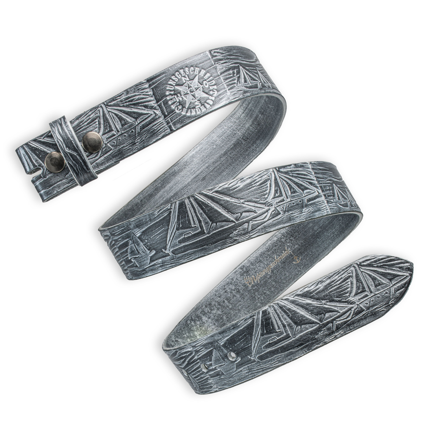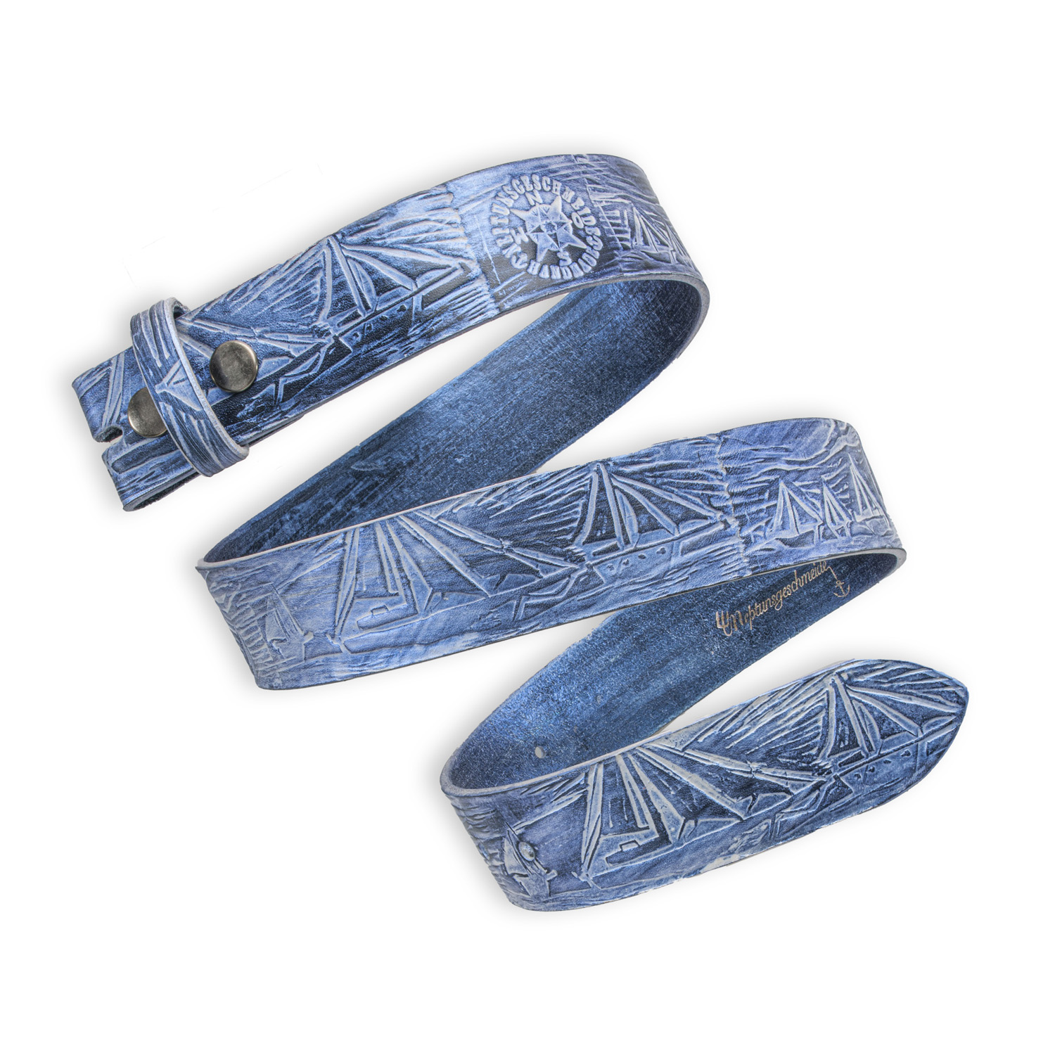 Handgeprägter Wechselgürtel Segelschiffe aus Leder, mit Druckknopfverschluss zum einfachen Wechseln der Gürtelschließe. Passt mit 4cm Breite ganz unkompliziert in Schlaufen von z. B. Jeanshosen. Die perfekte Prägung für alle Seebären, Süßwassermatrosen und jede Kapitänin – Segelschiffe!  Das Motiv des Ledergürtels steht für die Sehnsucht nach Freiheit und Ferne, die Leichtigkeit des Seins und niemals endendes Sommerglück. Eine wirklich lässige Ergänzung für Dein Segeloutfit, auf einer Regatta oder den Strandspaziergang. Mit dem Wechselgürtel Segelschiffe zeigst Du Deine Liebe zum Meer, aber auch Nichtsegler und Landratten lieben seine Symbolkraft. Natürlich gibt es Deinen neuen Lieblingsgürtel bei uns in Farben für jedes Outfit und jede Stimmung.